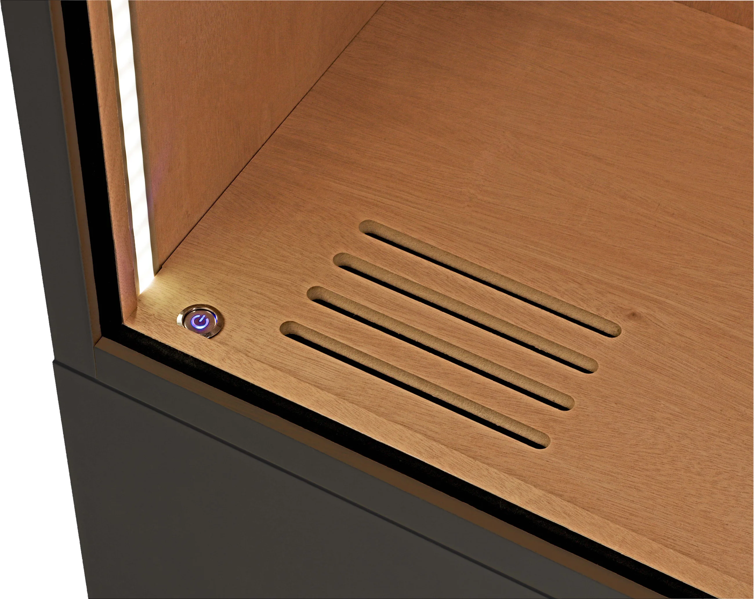 - Humidification parfaite contrôlée par microprocesseur et circulation idéale garanties par la double paroi arrière. L'humidité de l'air est répartie uniformément sur les différents étages de la cave.