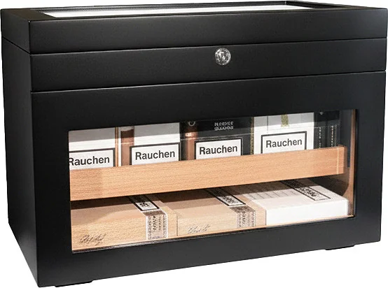 - Optional trays for individual cigars and boxes can be inserted and optionally angled for optimal presentation.