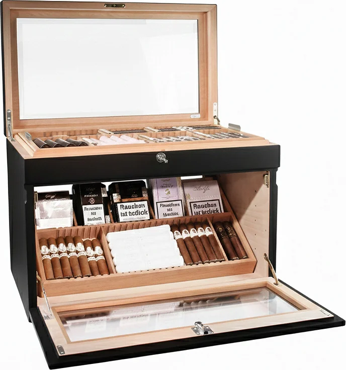 Multiple levels allow for the storage of individual cigars, boxes, or even entire cigar cases. The interior can be divided in various ways: