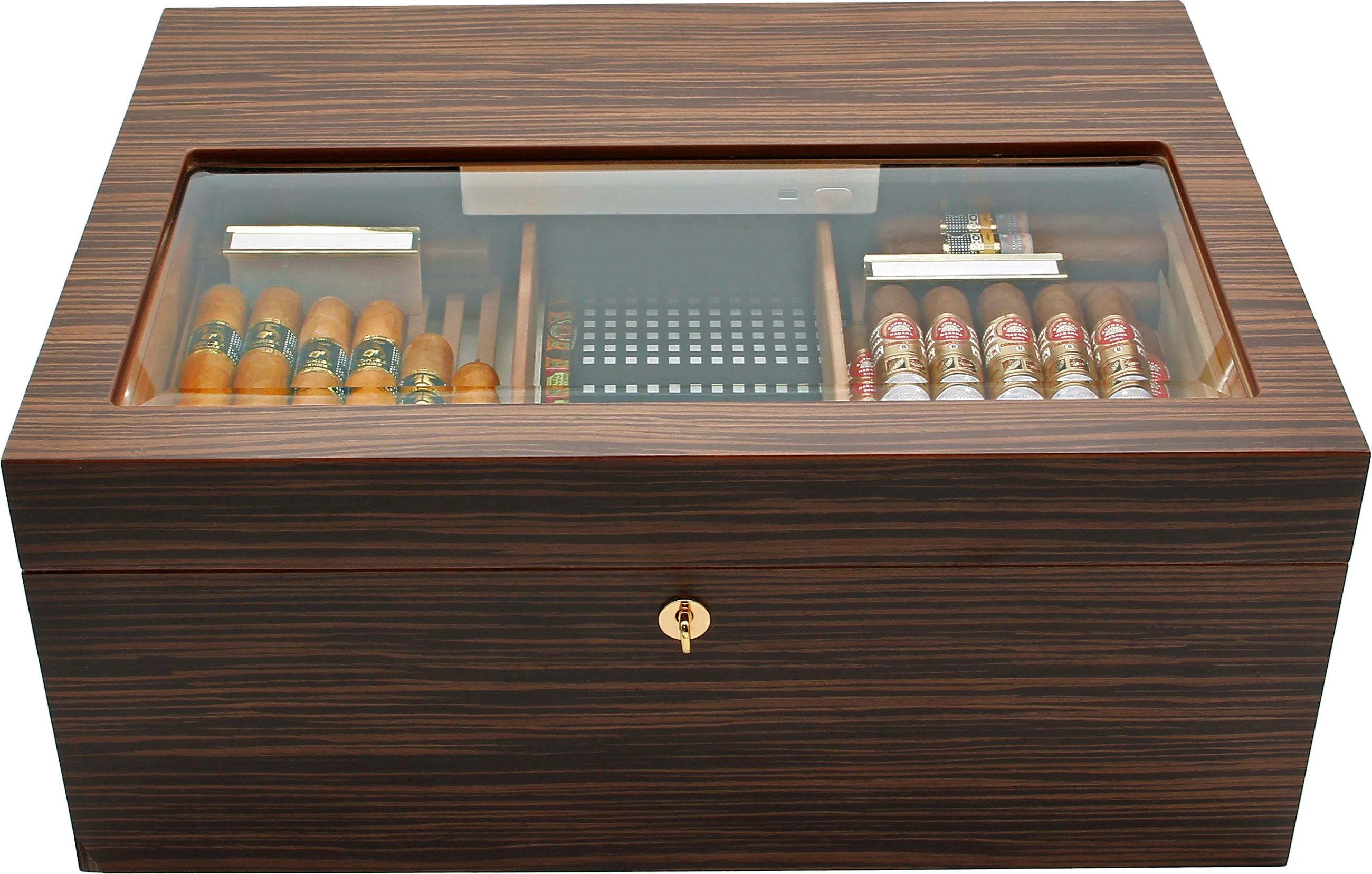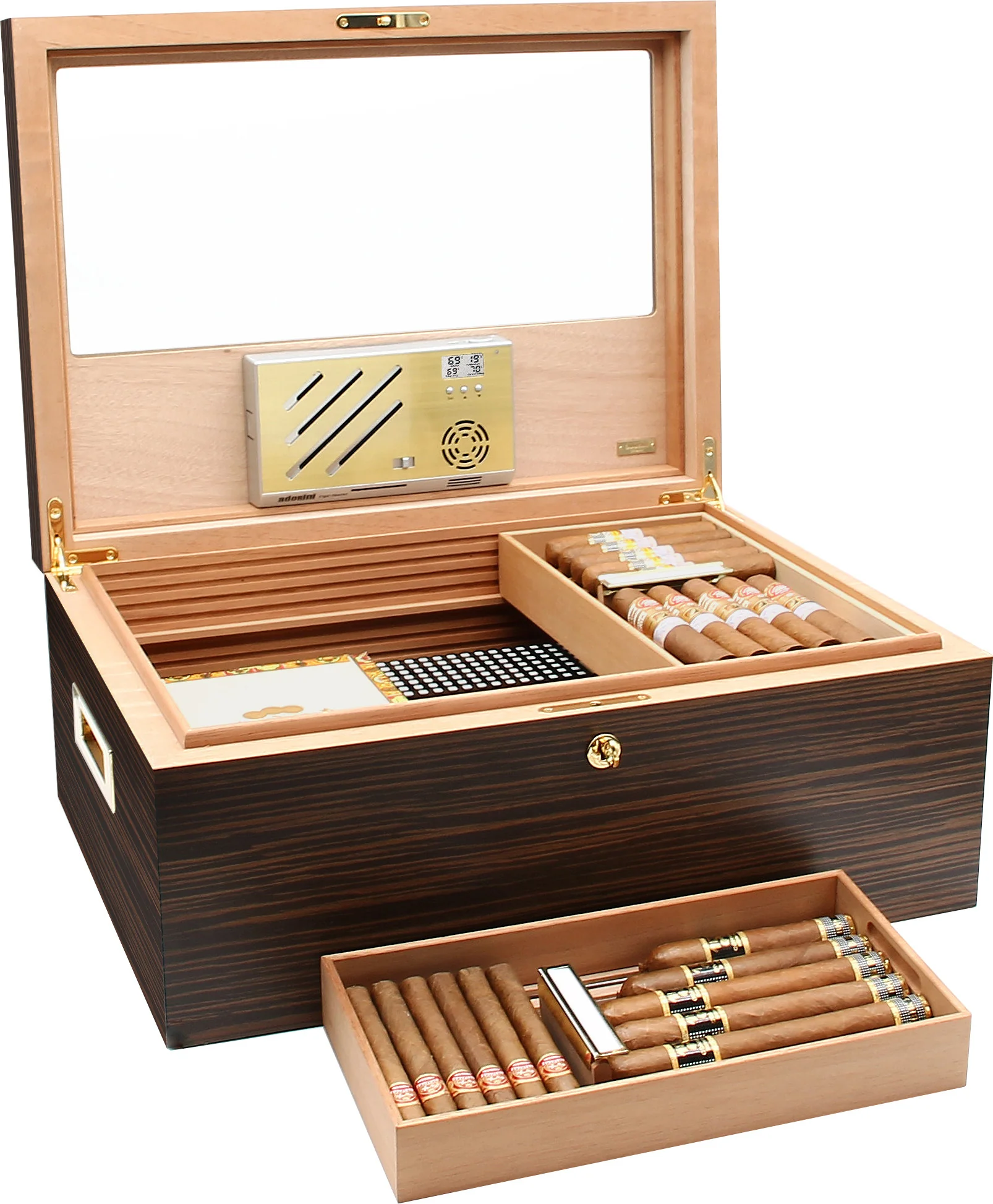 Une impressionnante capacité de 500 cigares Corona anime la cave magnifiquement conçue qui comprend une finition semi-brillante en placage d'ébène visuellement agréable et un couvercle avec une vitre partielle en verre. Les charnières à quadrant robustes et solide corpus donnent à l'humidificateur une base solide, un verrou et des poignées plaqués or fournissent sécurité et mobilité accrues. Le cèdre espagnol cuit à la vapeur extra-dur recouvre l'intérieur pour un environnement de cigares optimal, qui est encore amélioré par les nervures de ventilation innovantes Adorini RibTech qui aident à maximiser le flux d'air dans toute la cave.