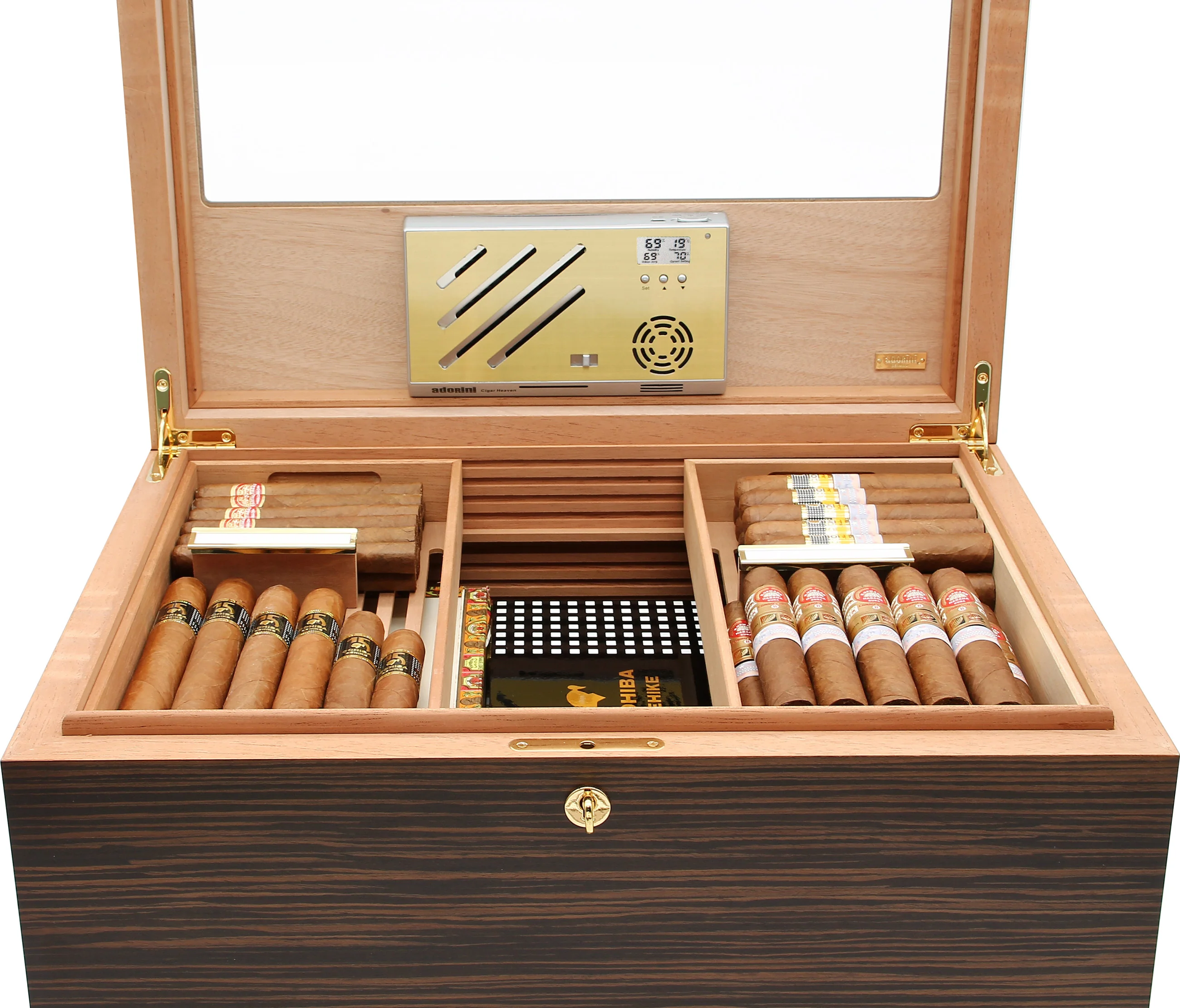 L’humidité est régulée par le système d’humidification électronique populaire Cigar Heaven 2ᵉ génération d’adorini. Cet humidificateur magnifiquement conçu peut être alimenté par un adaptateur secteur ou par sa batterie lithium-ion rechargeable intégrée, qui peut durer jusqu'à quatre semaines avec une seule charge. Le réservoir d'eau de l'appareil contient suffisamment d'eau pour près de deux mois d'humidification, qui peut être réglée manuellement entre 40 et 80% d'humidité relative. Un écran LCD affiche toutes les informations dont vous avez besoin pour maintenir des conditions idéales, y compris l'humidité et la température actuelles, les niveaux d'humidité élevés et faibles et le niveau d'humidité moyen sur 3 jours.