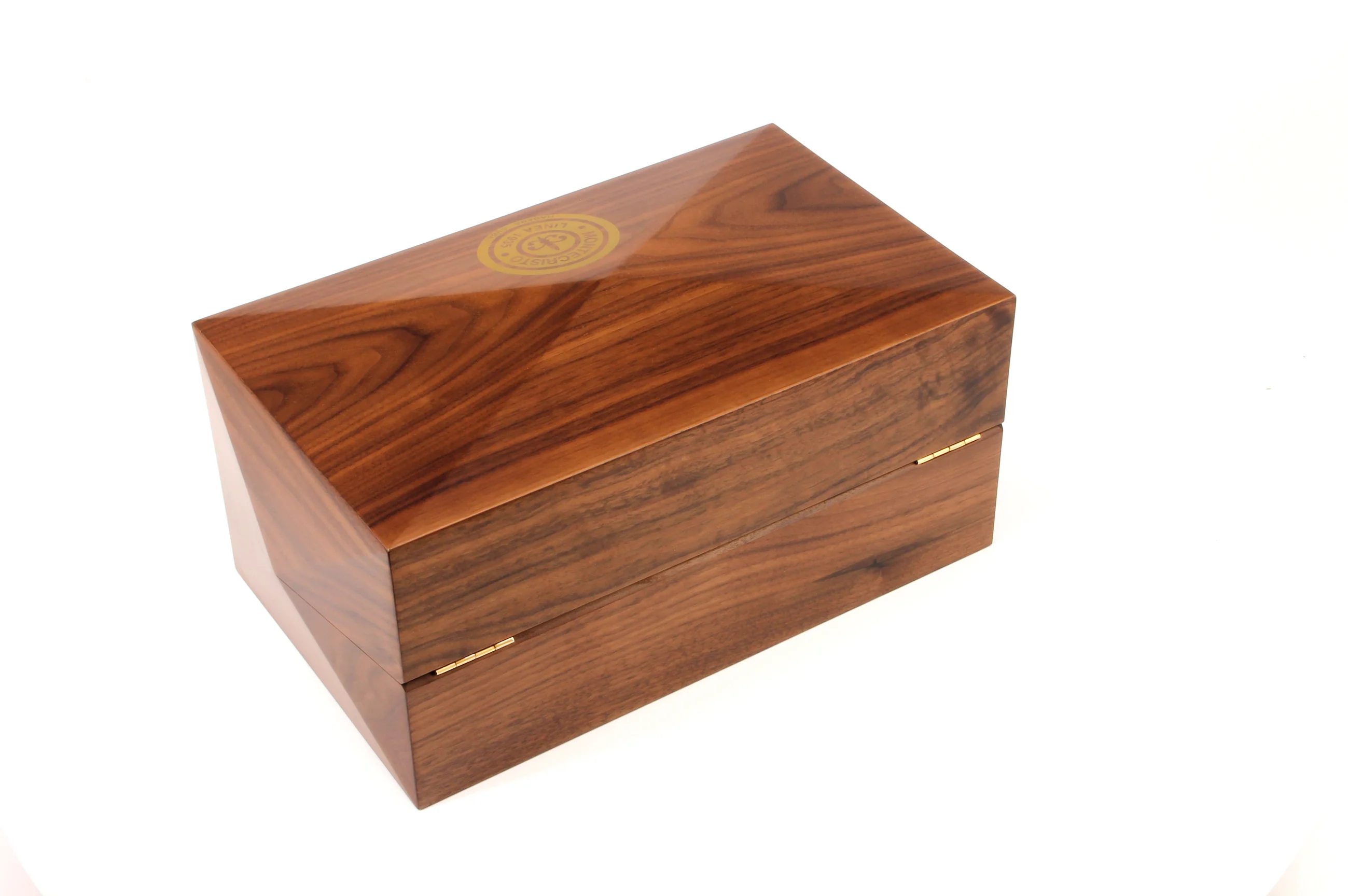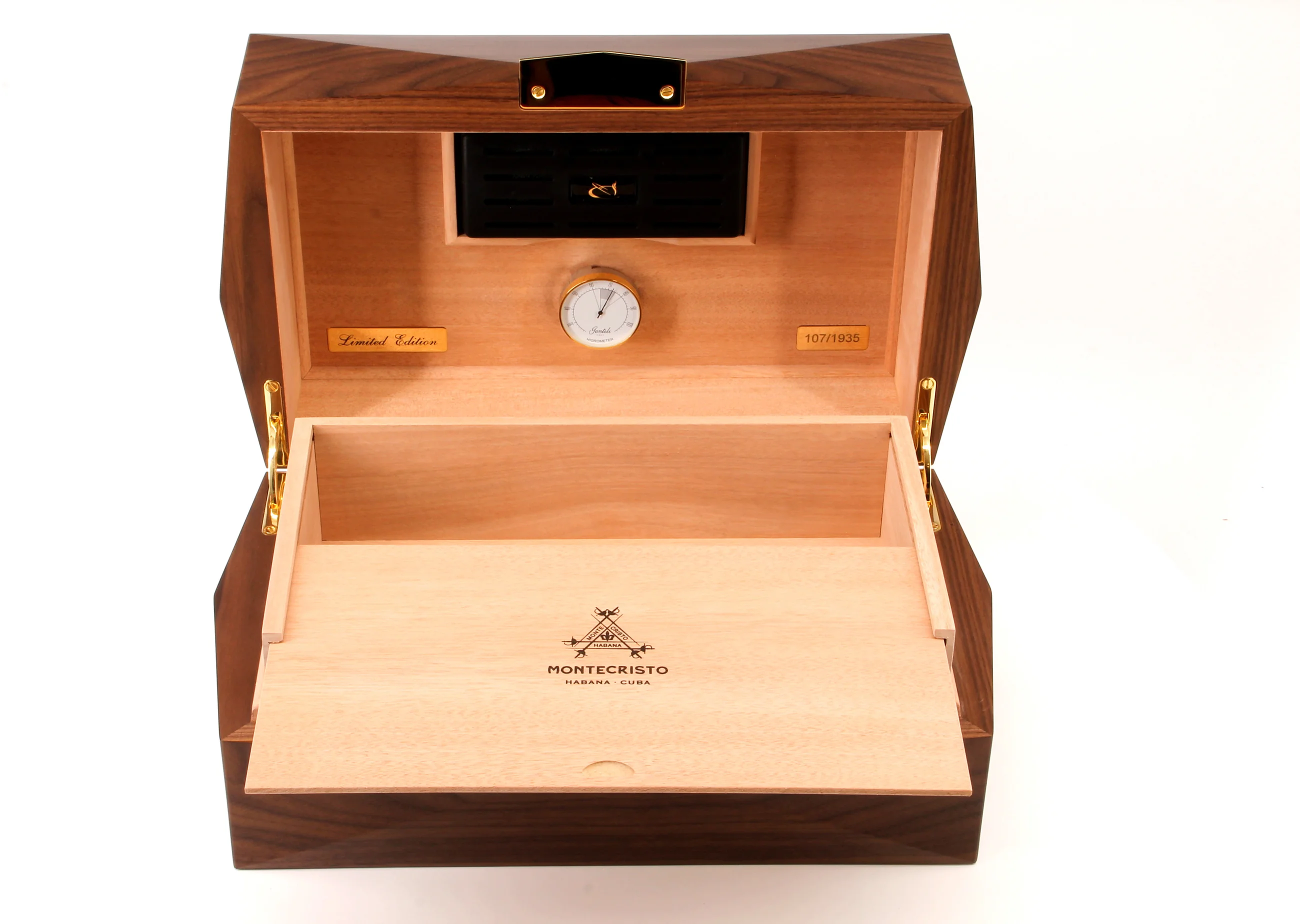 L'intérieur de la cave regorge de trésors merveilleux, sûr de vous faire sourire. Une boîte coulissante en cèdre amovible s'adapte parfaitement à l'intérieur de la cave à cigares et constitue un endroit idéal pour ranger vos cigares Montecristo les plus précieux. Un humidificateur et classique hygromètre analogique offrent un contrôle robuste de l’humidité pour jusqu’à 75 cigares de taille Corona . Chacun des 1 935 humidificateurs créés est noté avec son numéro d'édition correspondant.