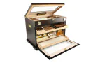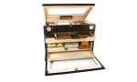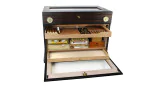 Un bel extérieur en ébène multi-laqué est complété par une serrure en laiton et une paire de poignées pour une mobilité pratique. Un thermomètre en laiton intégré rejoint un hygromètre à cheveux de précision sur le panneau avant pour plus d'élégance et une visualisation facile du climat de la cave. Des ouvertures séparées révèlent une gamme variée d'espaces de stockage pour jusqu'à 400 cigares Corona . Le compartiment supérieur est doté d'un panneau de visualisation en verre dans le couvercle et d'un plateau innovant en cèdre espagnol avec le design AirVent d'Adorini pour circulation améliorée. La partie avant de la cave qui comporte également un panneau de visualisation en verre se replie pour donner accès à un deuxième AirVent plateau, une zone de stockage de boîte et < solide> accessoire tiroir .