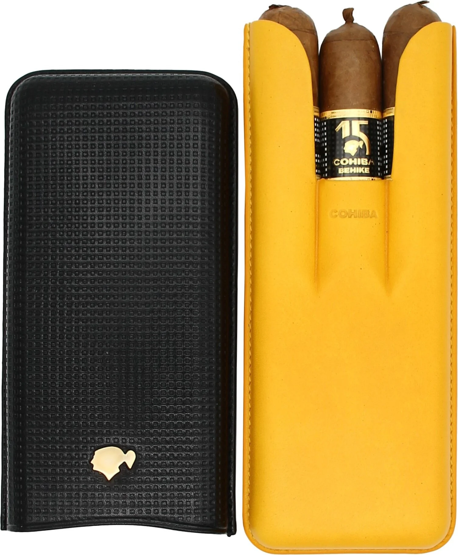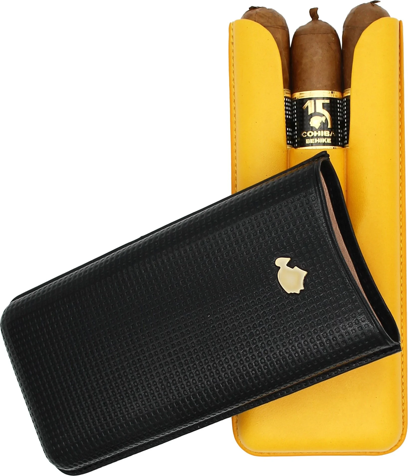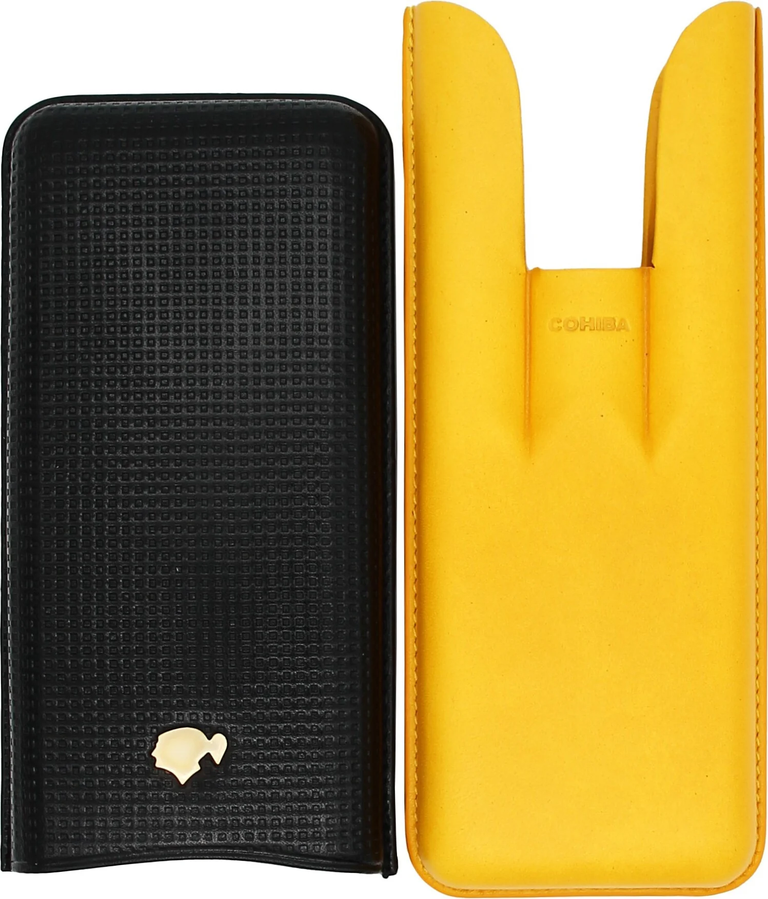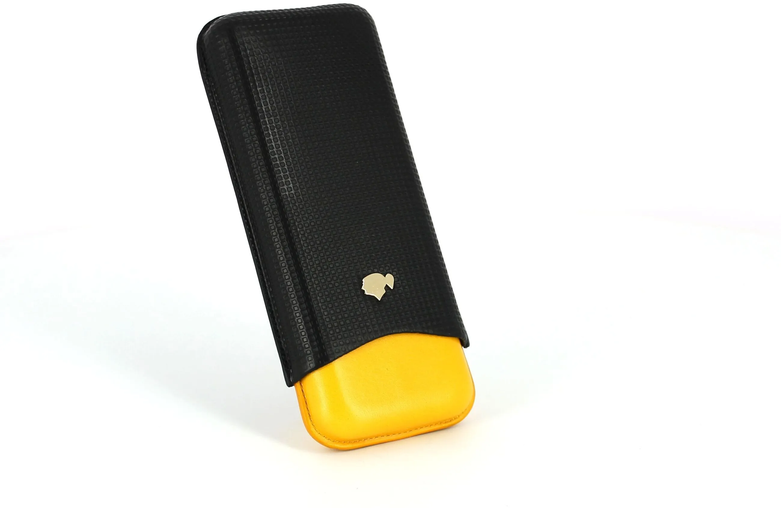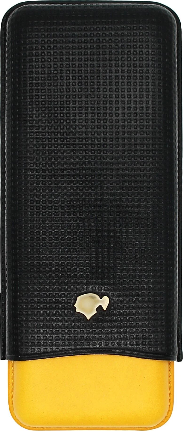Le cigare en cuir véritable espagnol L'étui attire immédiatement le regard avec ses couleurs bicolores jaune et noir, que les connaisseurs reconnaîtront instantanément comme un hommage au célèbre groupe de cigares de la marque. La partie supérieure noire du boîtier est décorée d'une grille texturée , façonnée d'après le motif carré familier du groupe de cigares Cohiba. La silhouette emblématique Taino en argent de Cohiba le complète avec une touche d'élégance.