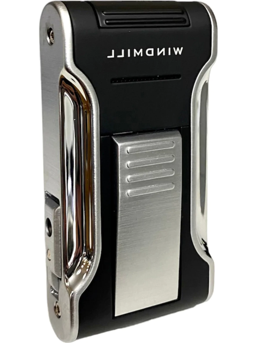 - Briquet à jet de la marque Windmill en noir mat et argent brillant.