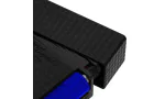 Le briquet présente un motif guilloché unique avec une finition noire semi-mate au toucher soyeux. Le rouleau bleu fluo constitue un élément de design frappant et dynamique.